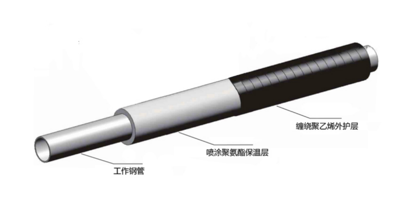 “聚氨酯喷涂聚乙烯缠绕预制直埋保温管” 由工作钢管、喷涂聚氨酯保温层、挤出聚乙烯外护层组成。保温层厚度和外护层厚度在生产时可以根据需要在一定范围内任意调整。可根据集中供热和供冷中介质的参数和实际的散热损失所要求的保温层厚度进行定量生产,满足不同项目的需要。